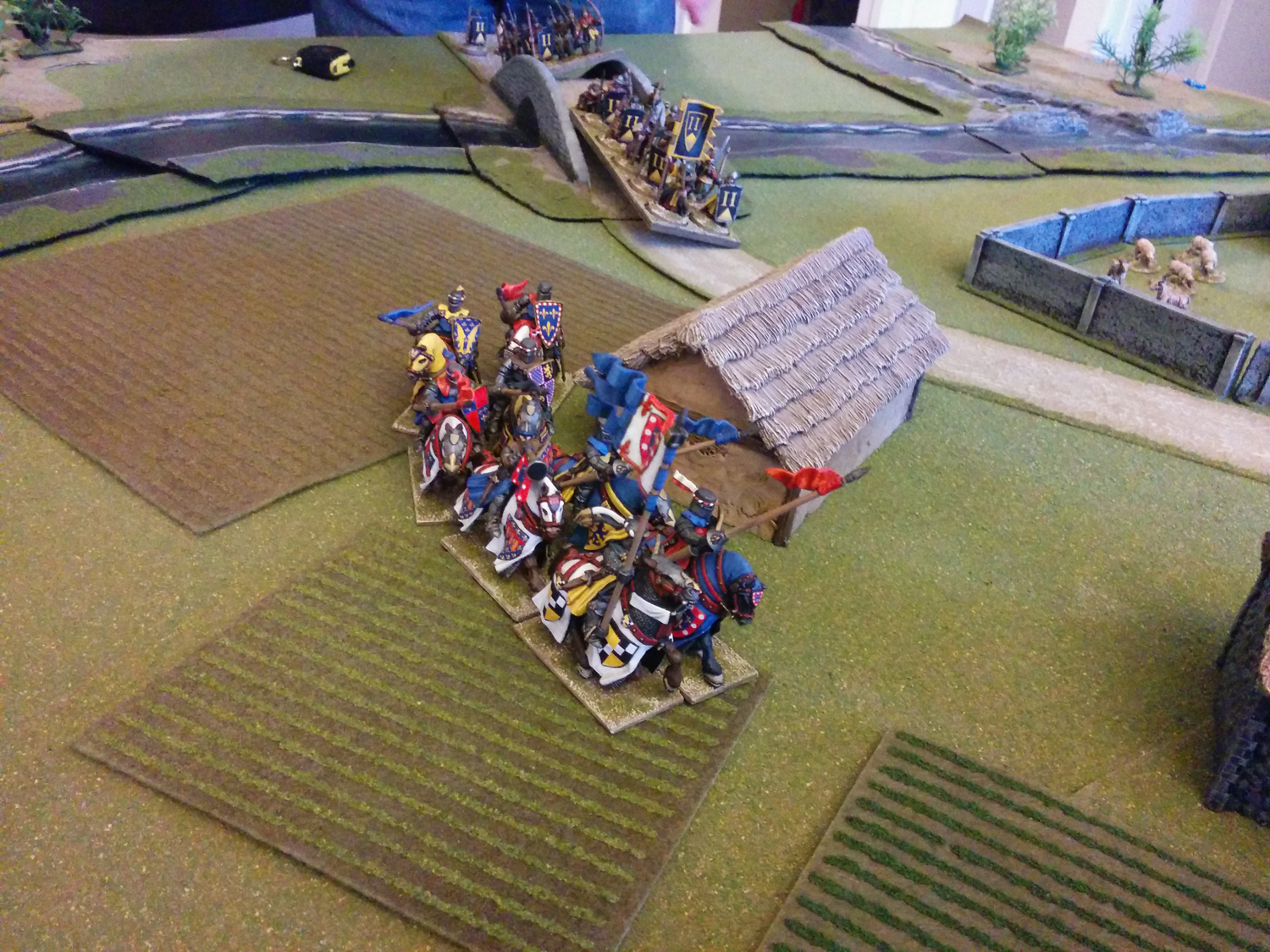 Above the sound of fighting come the sounds of horn calls and stamping hooves. Help has arrived! Quickly, the cavalry fans out to the wings while the captain rushes down the center to bolster the village men. In his wake follows a band of mercenary spearmen and archers.